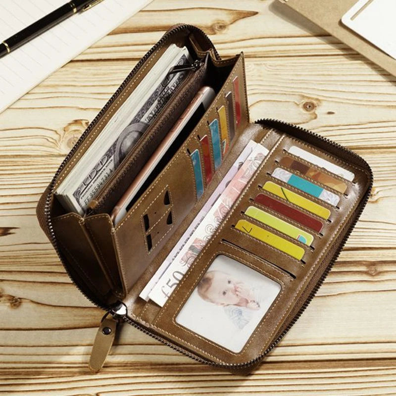 This vintage men's clutch wallet is made of split cow leather, featuring a solid design and a zipper closure. It is perfect for keeping your money and essentials organized in style.