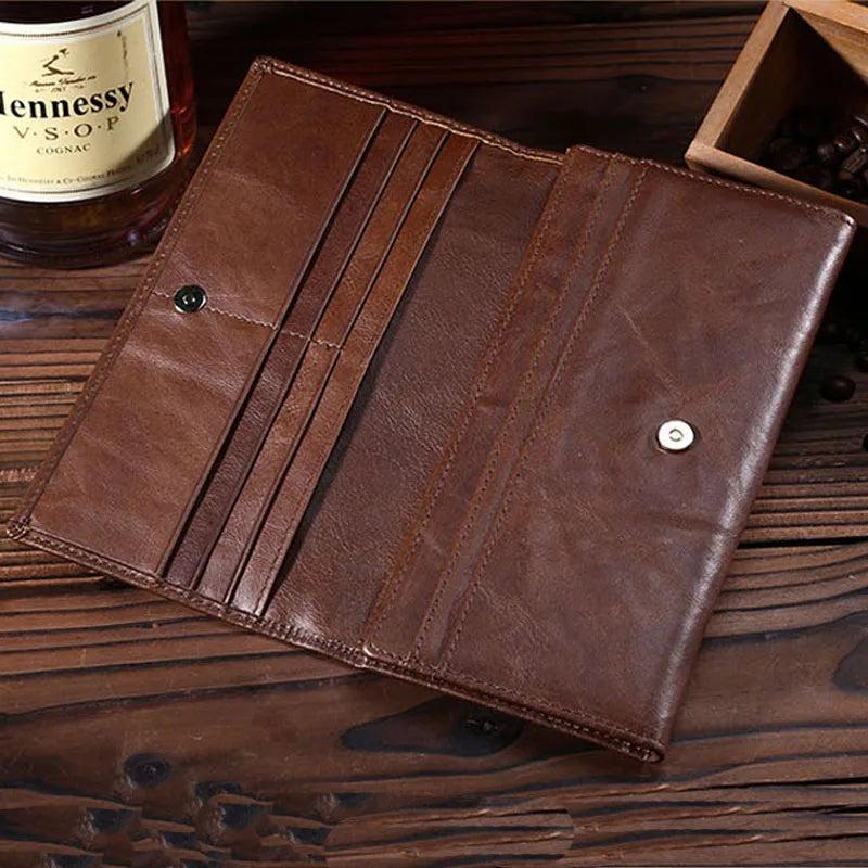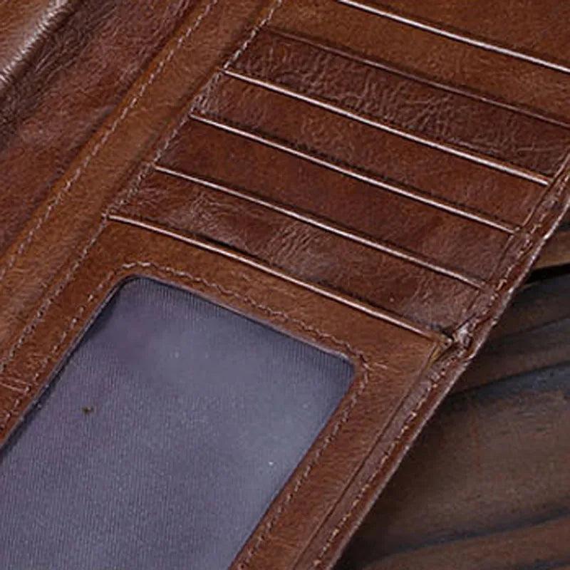 This long retro oil wax leather wallet is made from high-quality cowhide, perfect for everyday use. The vintage design adds a touch of style to your look.