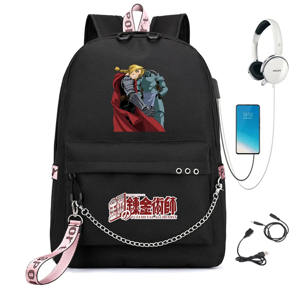 Anime FMA Backpack USB Headphone Teen Student School Bag Travel Laptop Rucksack