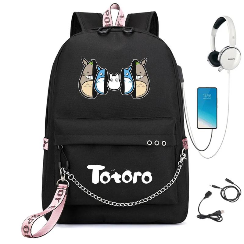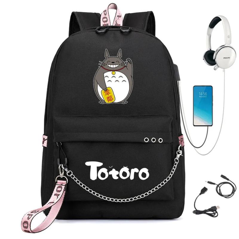 Anime Totoro Print Backpack USB Charging Headphone Zipper Cart
