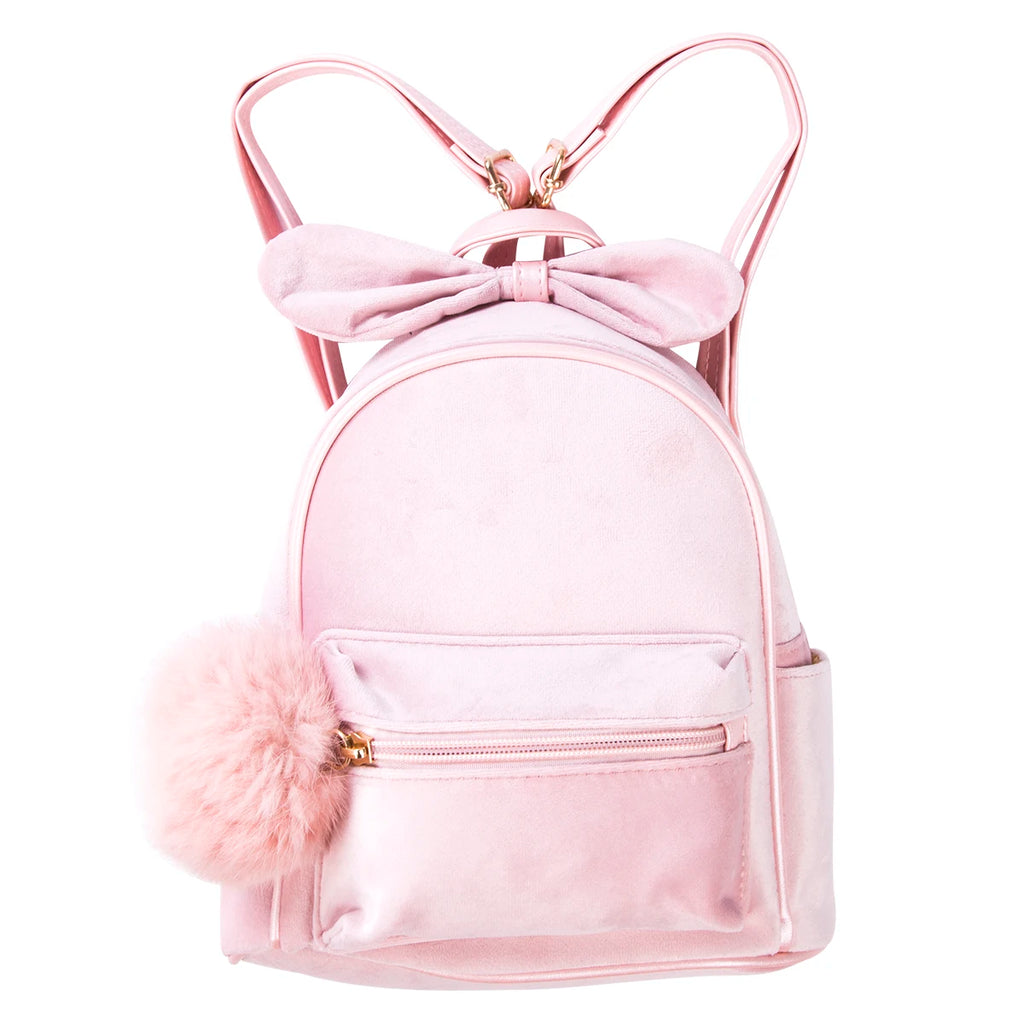 This adorable backpack is designed for young kids, perfect for carrying essentials to kindergarten or school. The cute bowknot and plush ball details add a fun touch.