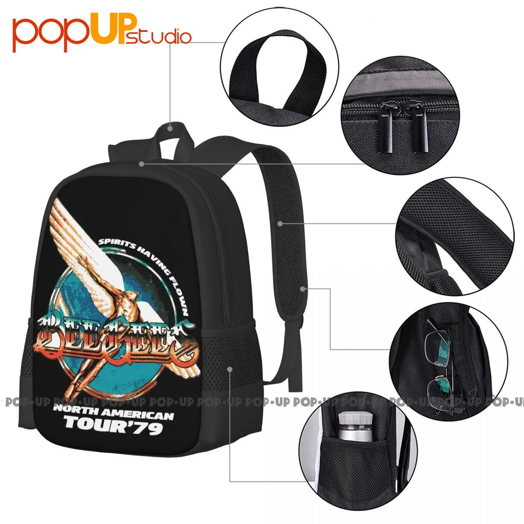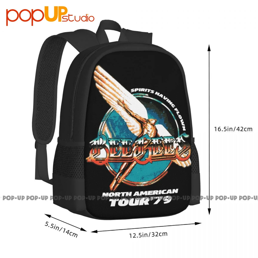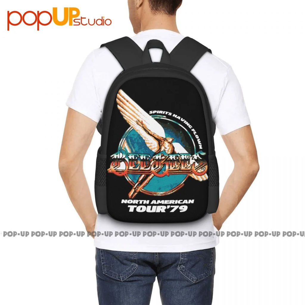This backpack features a vintage-inspired Bee Gees World Tour 1979 art print, perfect for sports or travel.