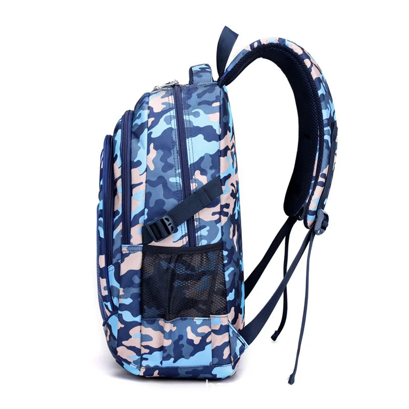 This camouflage backpack is designed for children, featuring orthopedic support for comfortable carrying. It is perfect for teenagers and kids going to school.