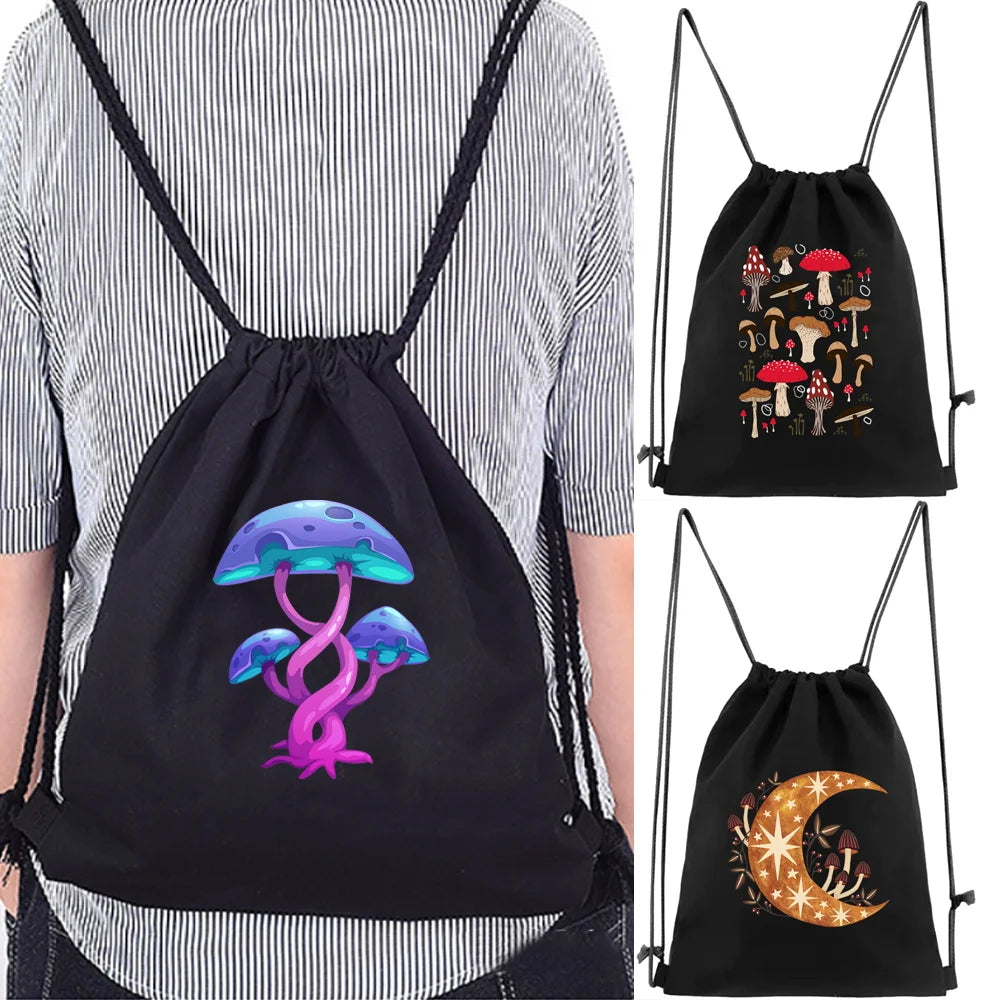 This Canvas Drawstring Backpack features a Mushroom Series Pattern, making it ideal for casual use, gym, school, travel, and storage.