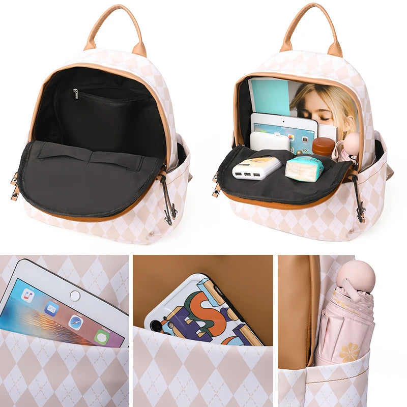Elegant and versatile set including a high-quality soft leather backpack and plaid shoulder bag.