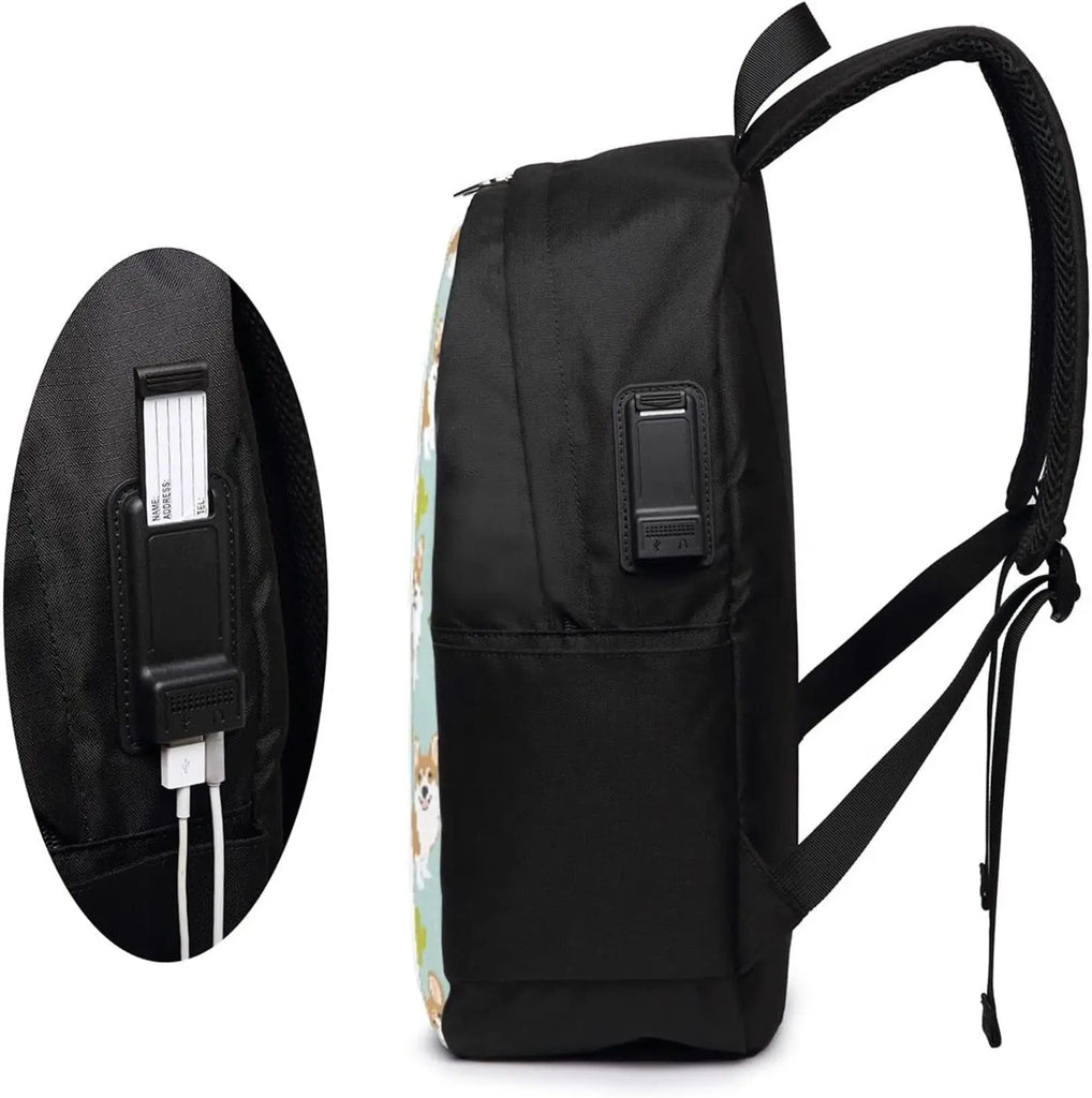 Adorable and functional backpack featuring Cartoon Welsh Corgi Cactus Dogs design. Equipped with a USB charging port, perfect for school, work, or travel.