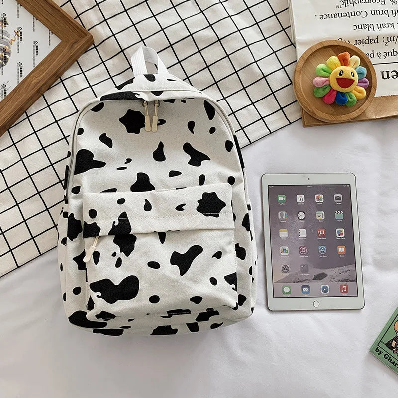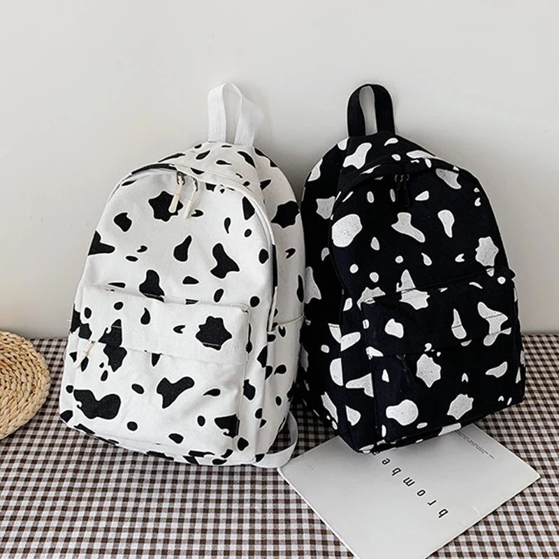 This stylish backpack features a cow pattern design on canvas material. It has a large capacity ideal for school or casual use. The spot contrast adds a trendy touch to the bag.