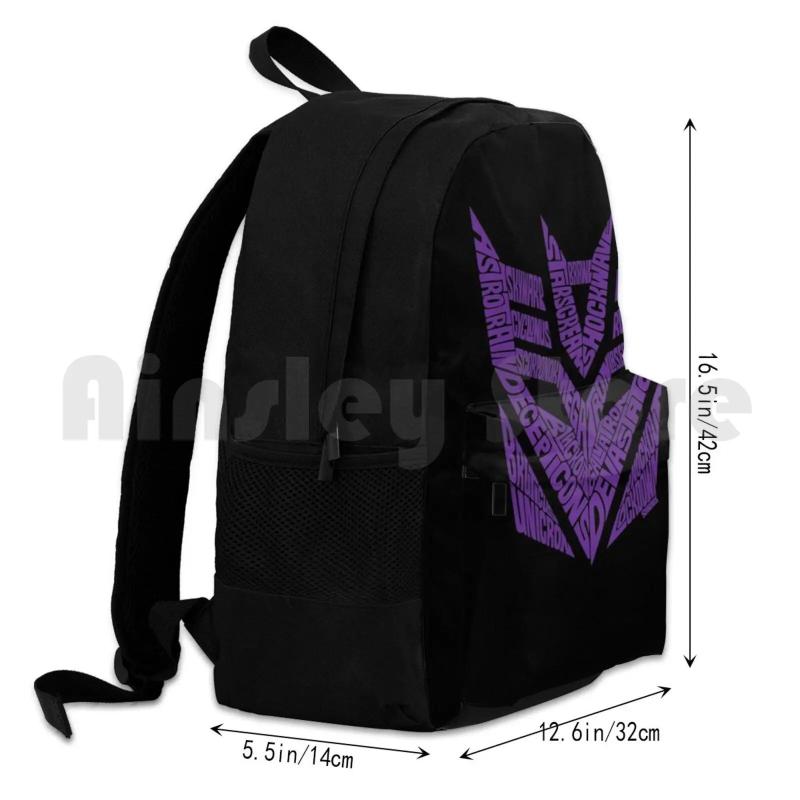 Get ready for your outdoor adventures with this Decepticons purple hiking backpack featuring a waterproof design. Perfect for camping and travel, this backpack showcases Autobots Decepticons comics typography from the Seanings movie show.