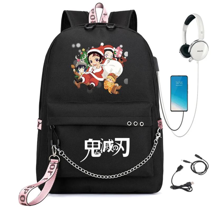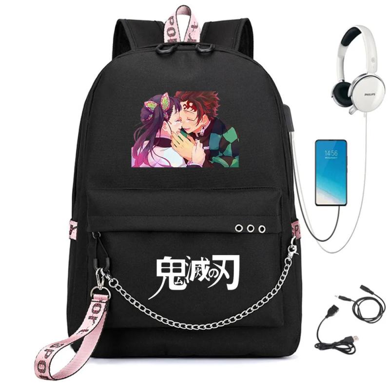 This backpack features a cool Demon Slayer Kimetsu no Yaiba design and is made of durable nylon. It's perfect for school or casual use and even has a USB port for charging devices on the go.