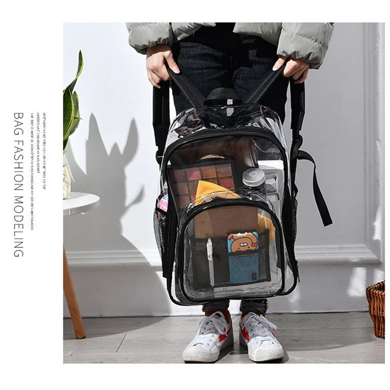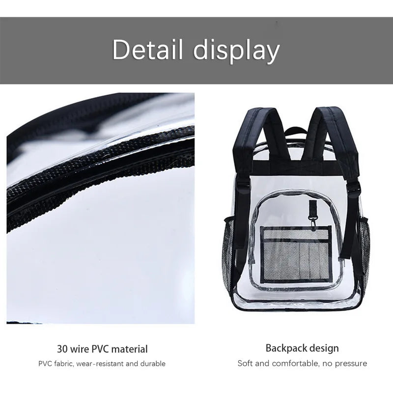 This eco-friendly transparent backpack is made of wear-resistant PVC material. It has a large capacity for storage and is perfect for school use.