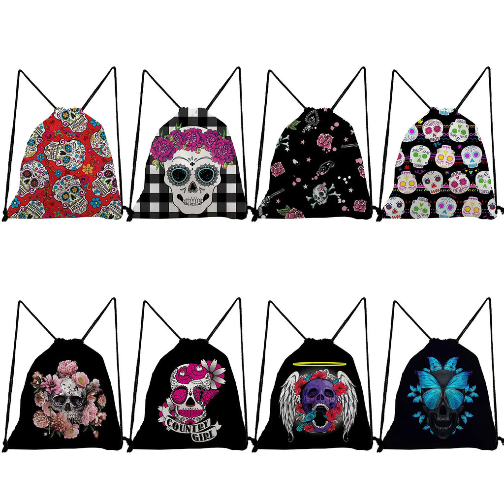 This trendy backpack features a floral skull print design, making it a stylish choice for students. The drawstring closure and portable size make it easy to carry around. Perfect for Halloween candy gifts or everyday use.