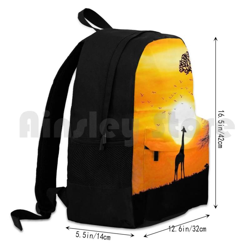 Experience the beauty of Africa with this outdoor hiking backpack featuring a stunning sunset with a giraffe silhouette.