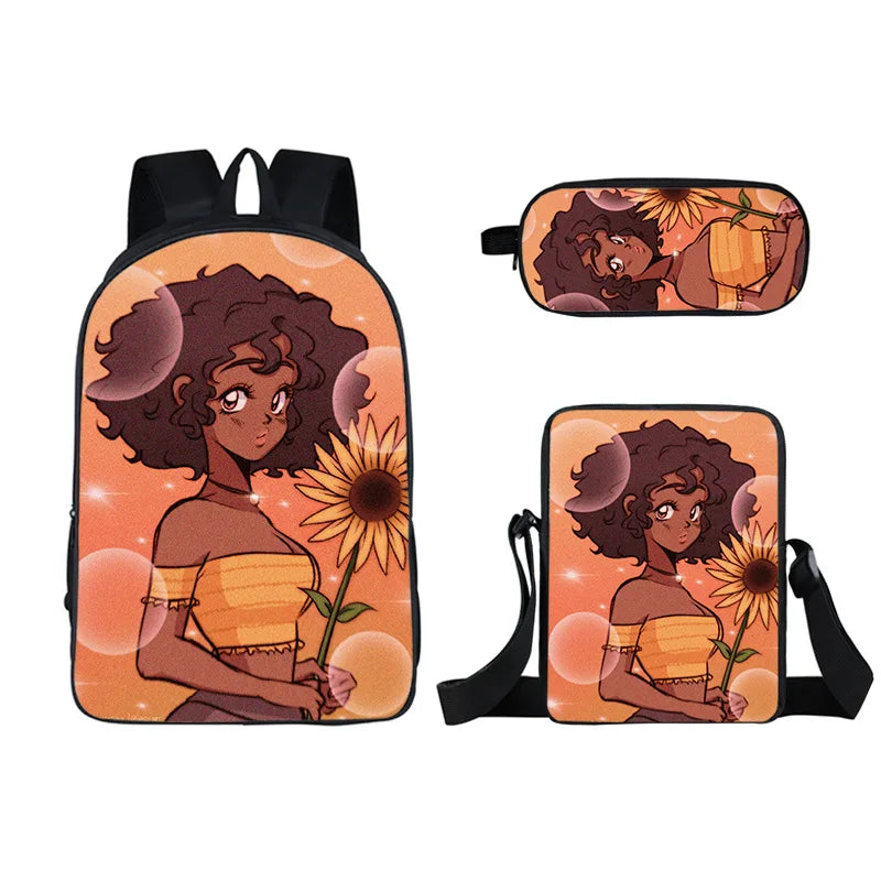 This cute schoolbag features a girl cartoon design. It comes with a double pencil bag and messenger bag combination.