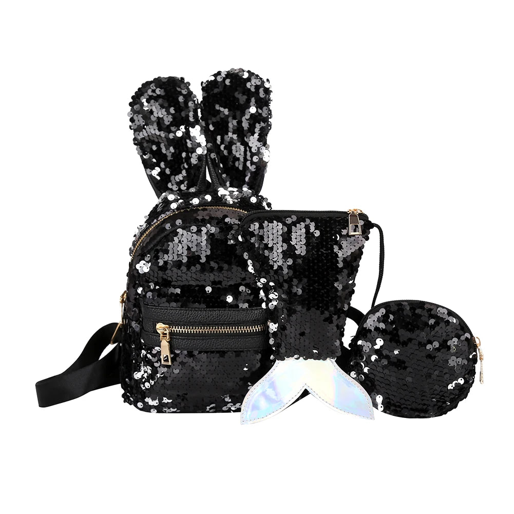 This 3-piece set includes a glitter backpack featuring rabbit ears and sequins, perfect for school, kindergarten, or teens.
