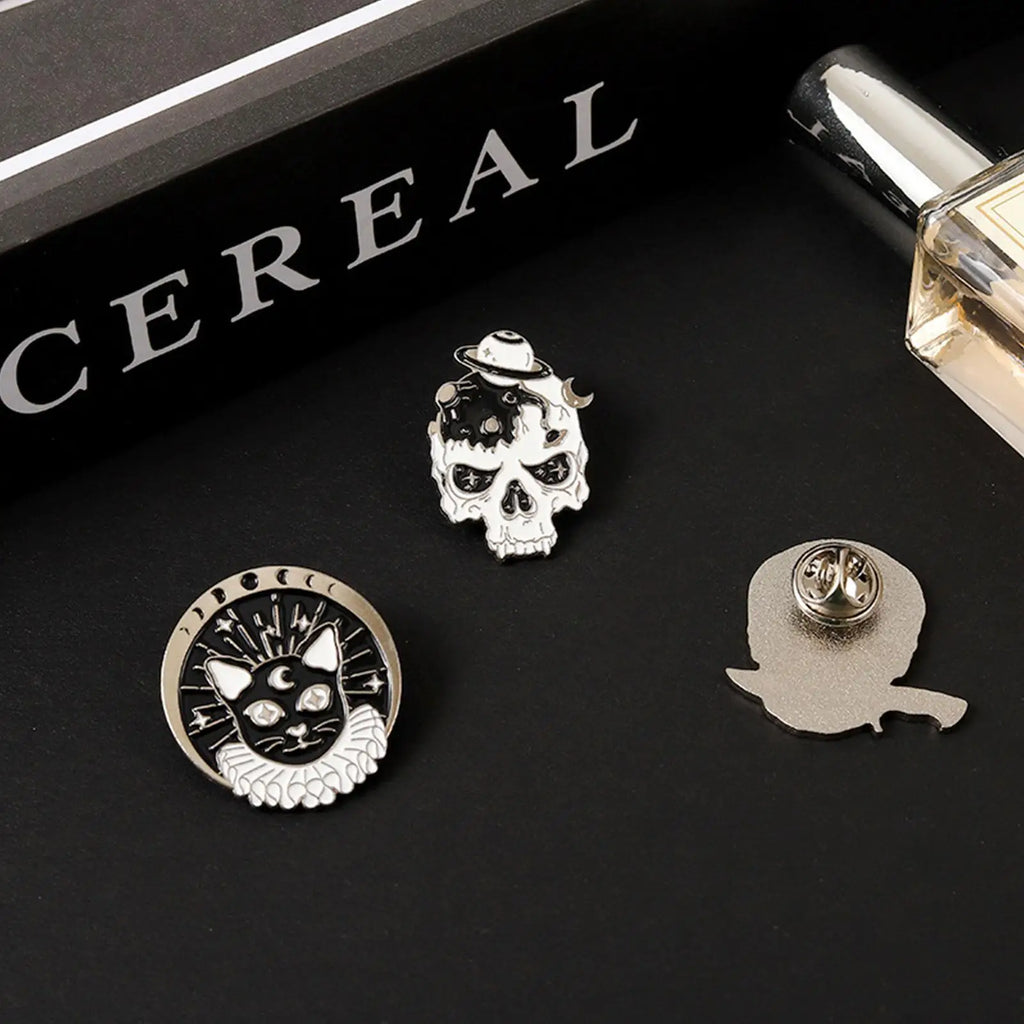 - Enamel pins with horror skull, spooky skeleton, and cat designs