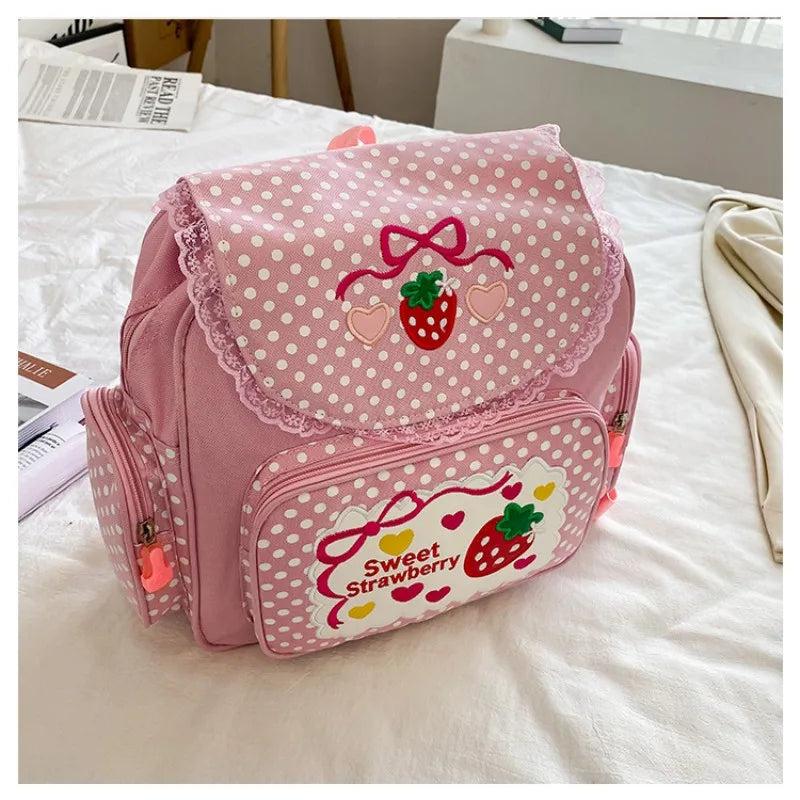 This sweet and lovely backpack is perfect for schoolgirls with its cute fruit strawberry embroidery and lace design. A must-have for fashionable students!