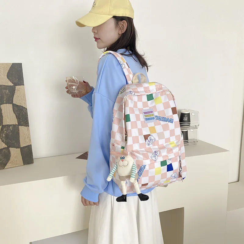 This female bear plaid backpack offers a fresh contrast in design, perfect for school students in a Japanese-inspired fashion.