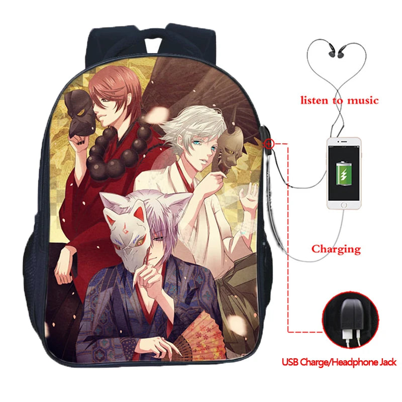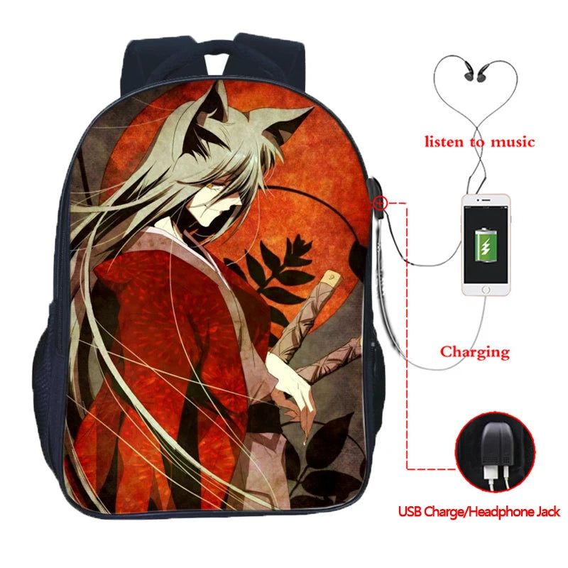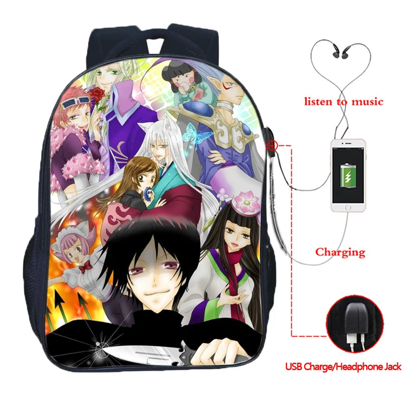 This backpack features a Kamisama Kiss design with a built-in USB charging port. It is perfect for students and travelers.