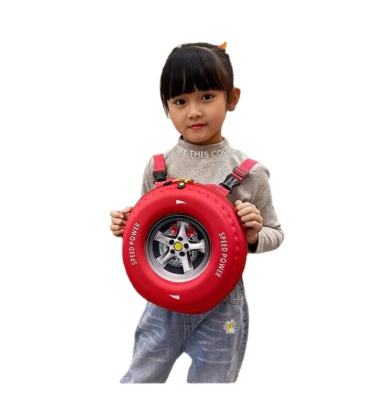 This kindergarten school bag is designed as a cartoon car wheel shape, perfect for boys and girls. It is waterproof and ideal for carrying snacks or small items.