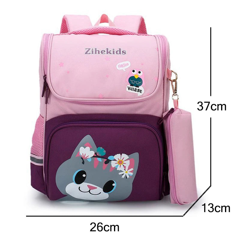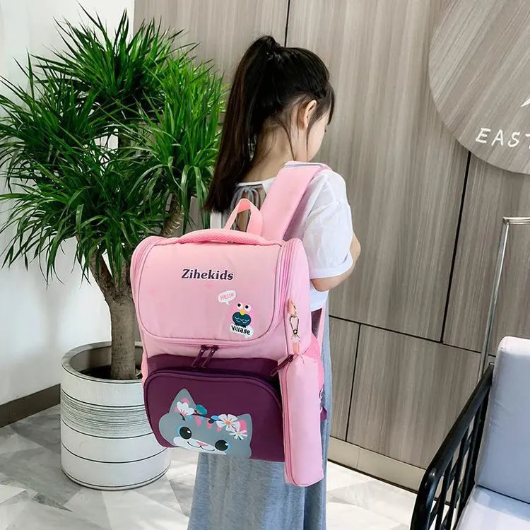 This children's school backpack features a cute cartoon print, ideal for girls and boys. It offers ample storage space for books, notebooks, and school supplies. The shoulder straps provide comfort for carrying.