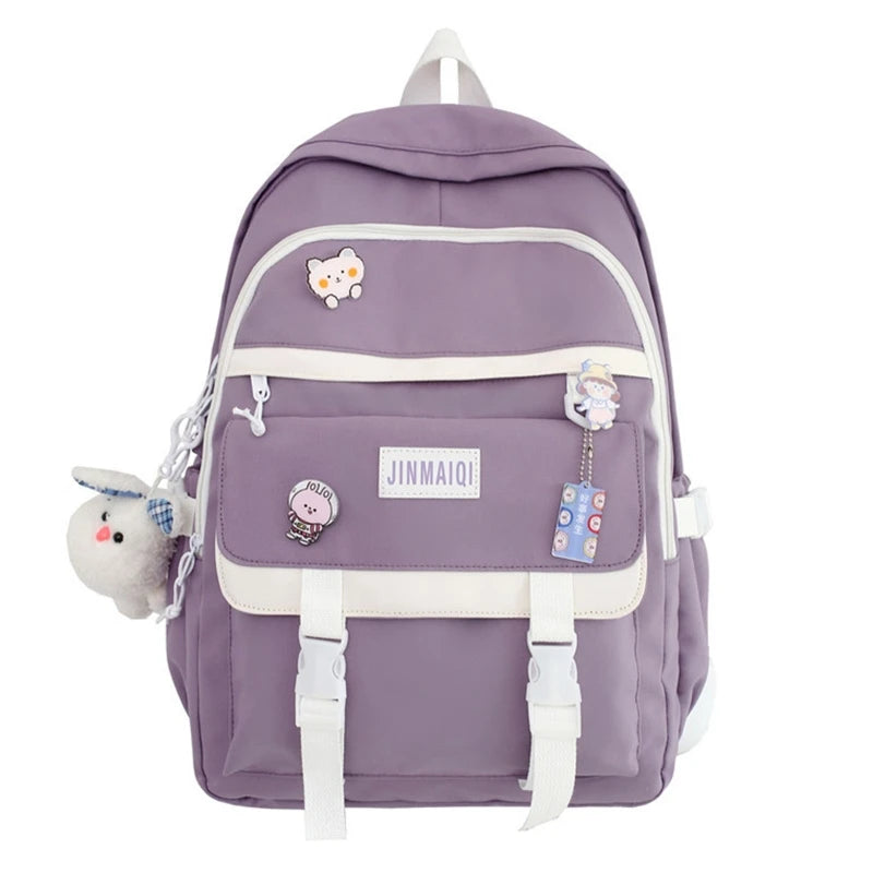 This backpack is perfect for students and travelers. Made of durable nylon, it features a cute plush pendant and pin accessories. The spacious design allows you to carry all your essentials comfortably.