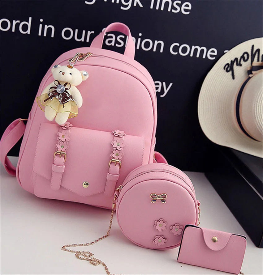 This stylish leather backpack set is perfect for women and girls. It includes multiple bags for different occasions.