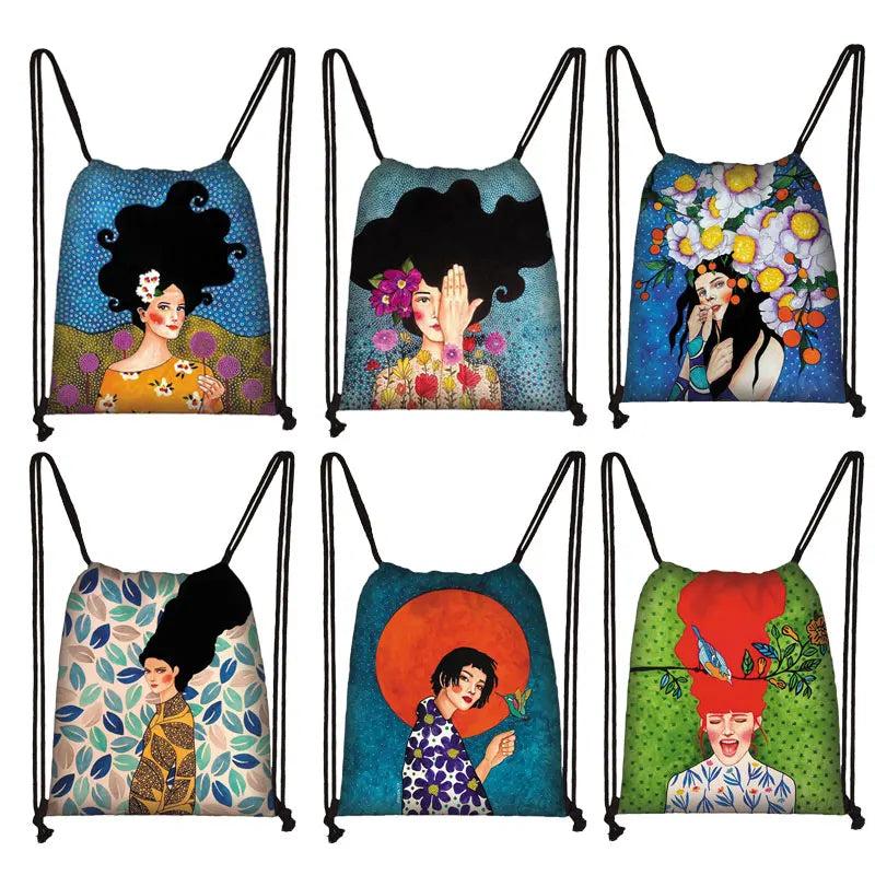 Long Hair Retro Oil Painting Drawstring Bag for Travel