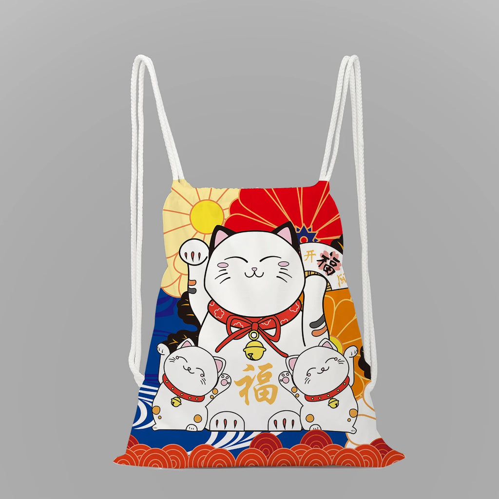 Lucky Cat Print School Backpack Girls Drawstring Bag String Bag