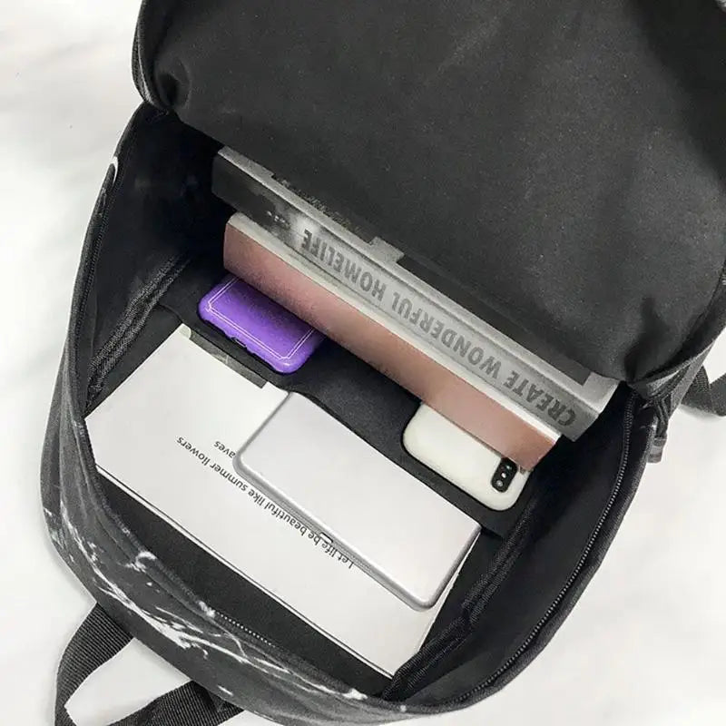 This stylish backpack features a trendy marble stone print design. Made from durable canvas, perfect for school or daily use.