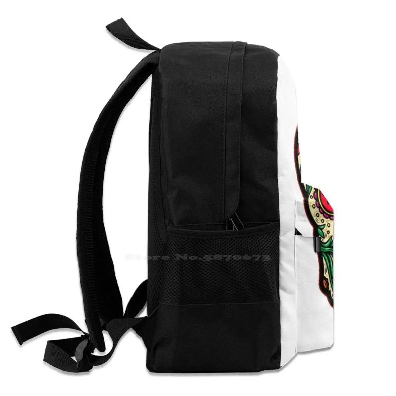 This stylish backpack features a Mexican sugar skull design, perfect for those who love the sugar skull aesthetic. It has a big capacity, suitable for carrying a laptop up to 15 inches. The design includes elements of skull, skeleton, death, horror, and scary themes.