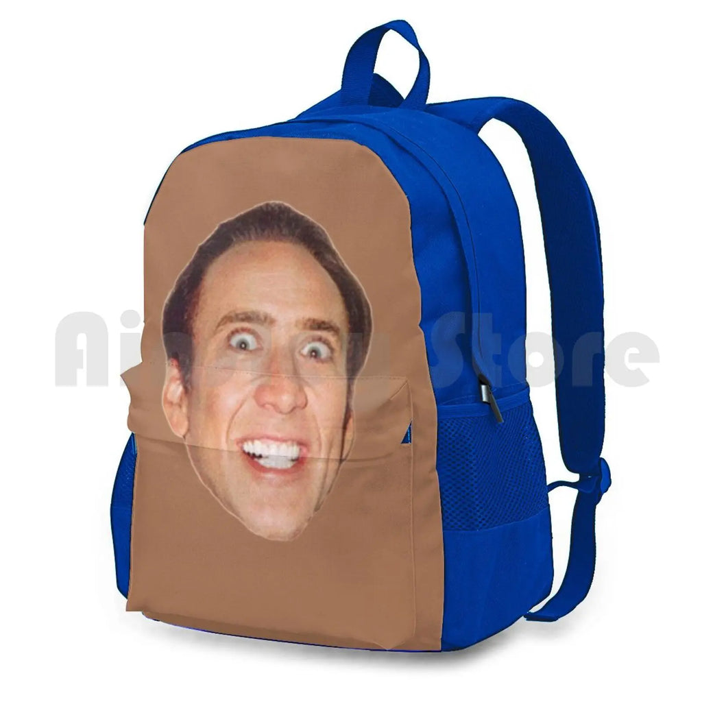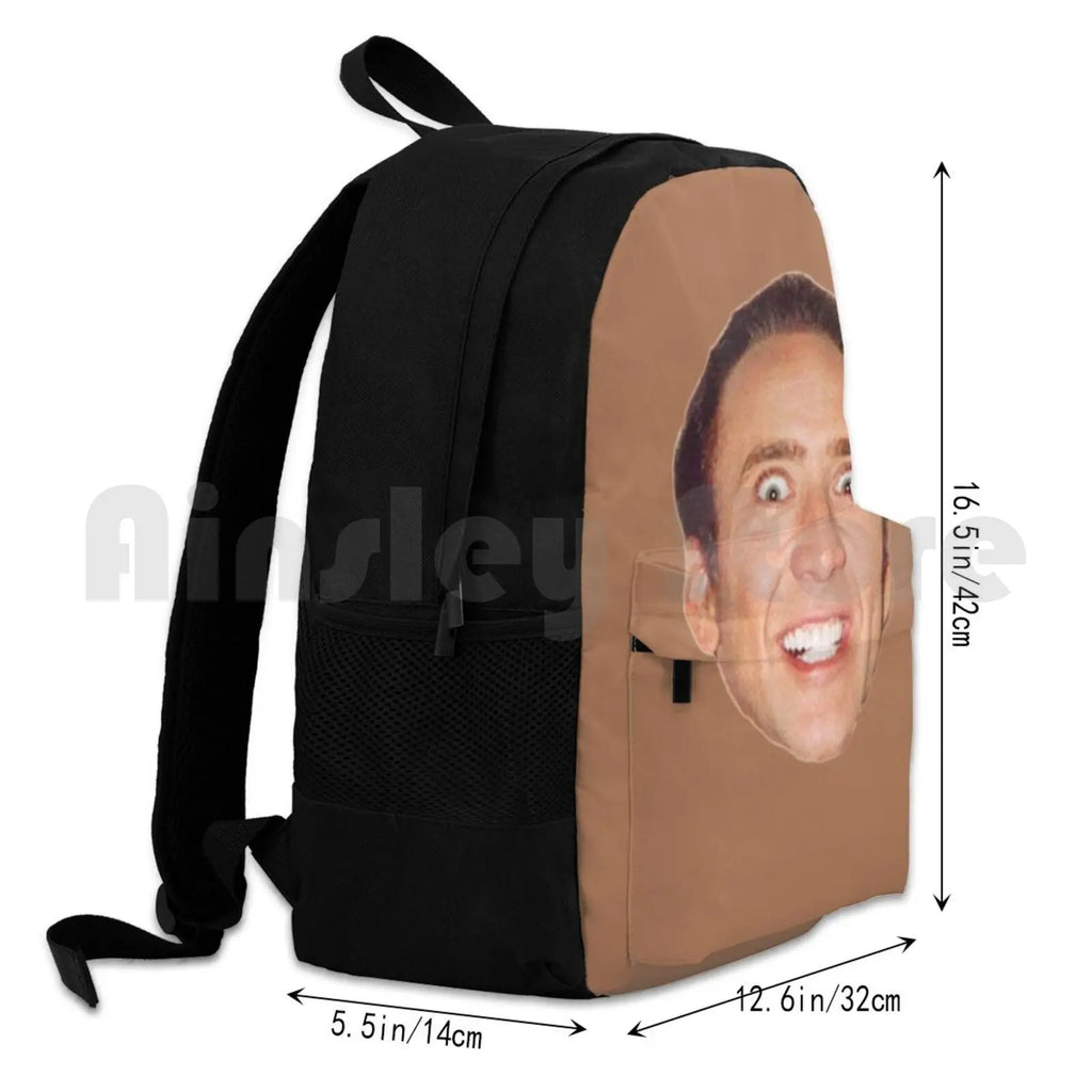 Stay dry and stylish with this waterproof hiking backpack featuring a fun Nicolas Cage design. Perfect for camping and travel.