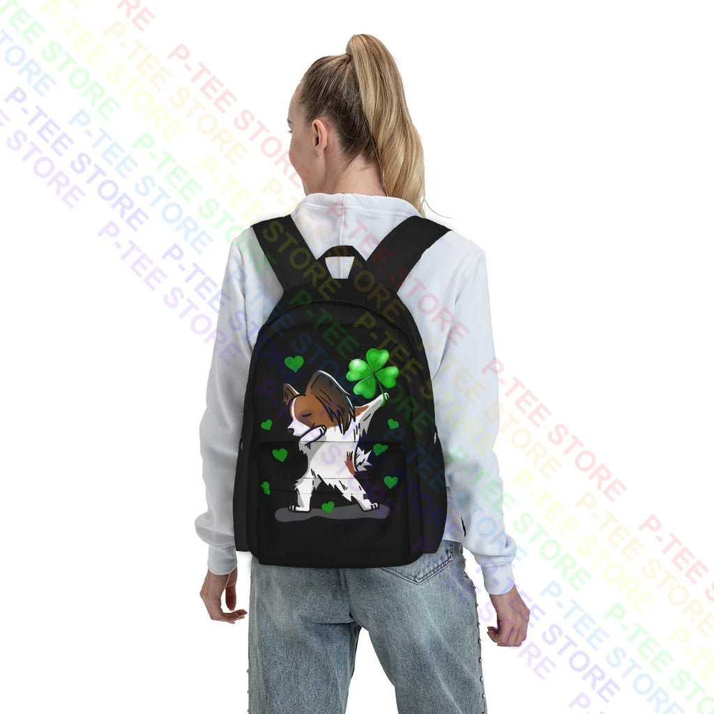 Stay stylish and sporty with this large capacity backpack featuring a Papillion dog dabbing design and lucky Irish shamrock.