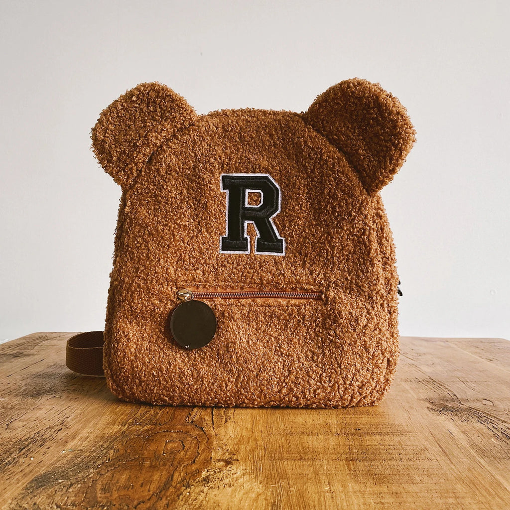 This cute bear-shaped mini backpack is ideal for children, featuring an embroidered initial and personalized name. It's perfect for travel, shopping, or daily use.