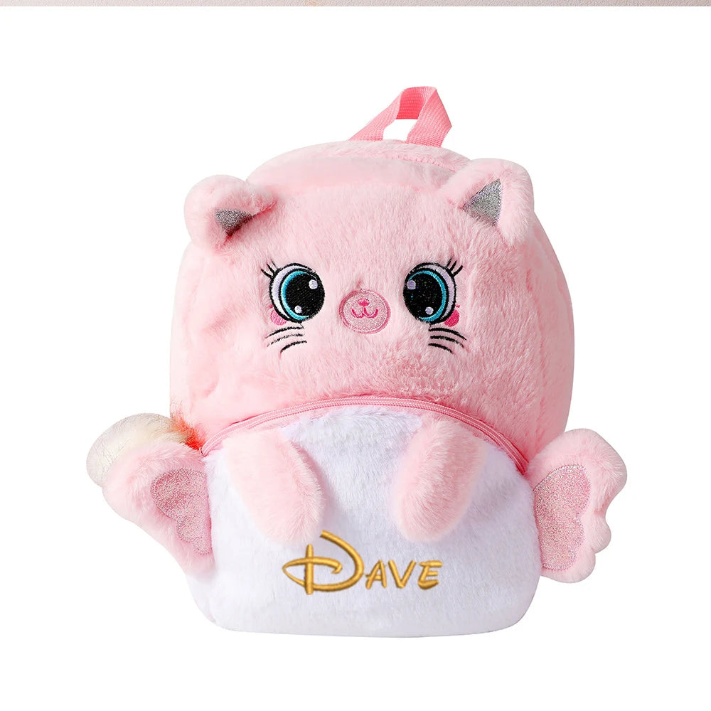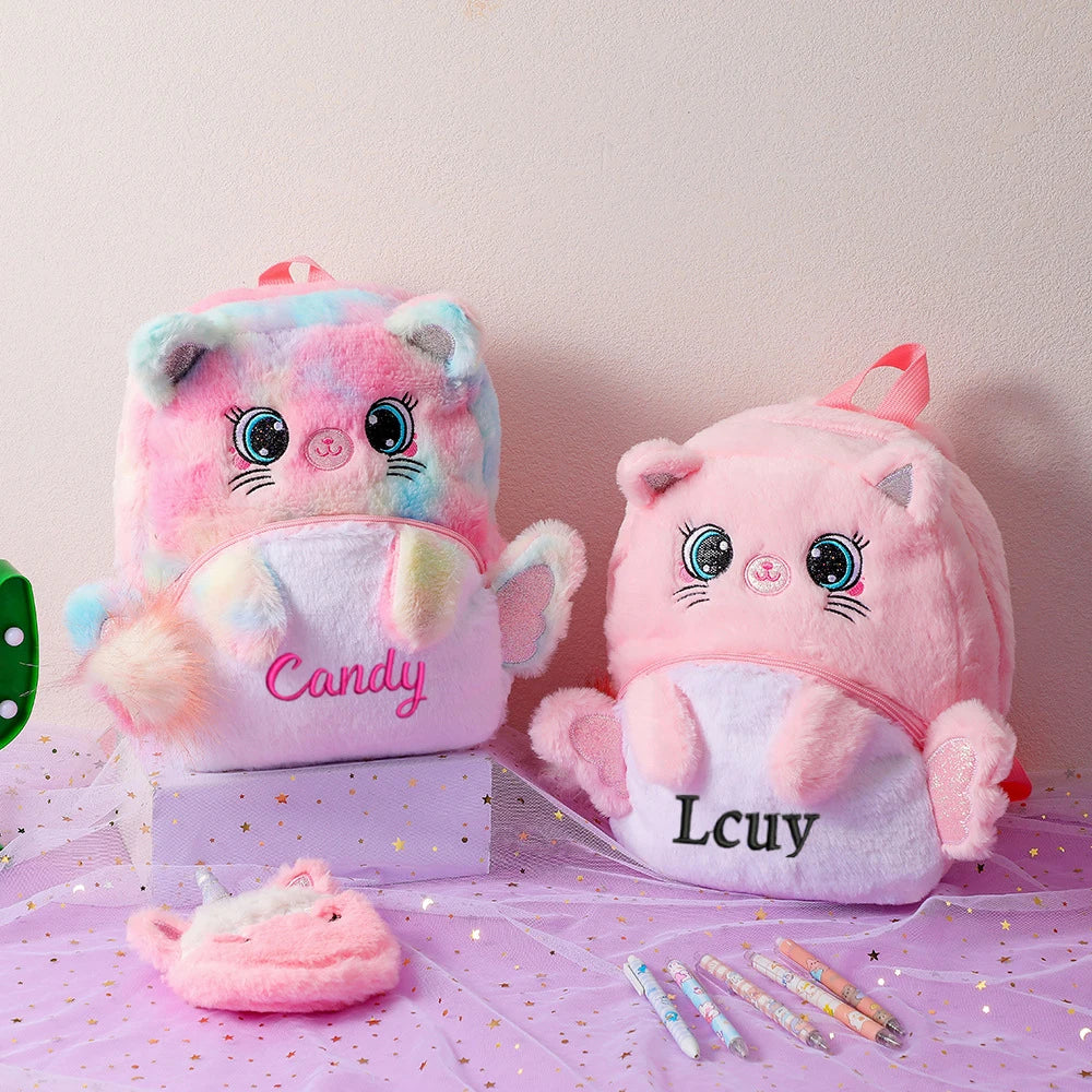 Adorable unicorn plush backpack for girls with personalized embroidered name. Perfect for kindergarten and schoolbags in winter season.