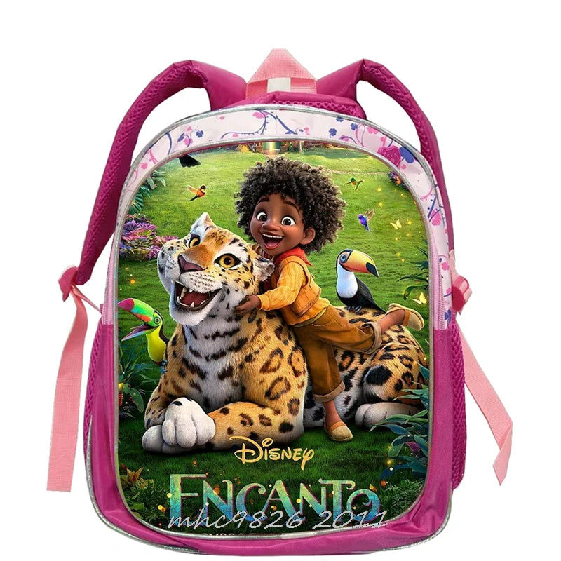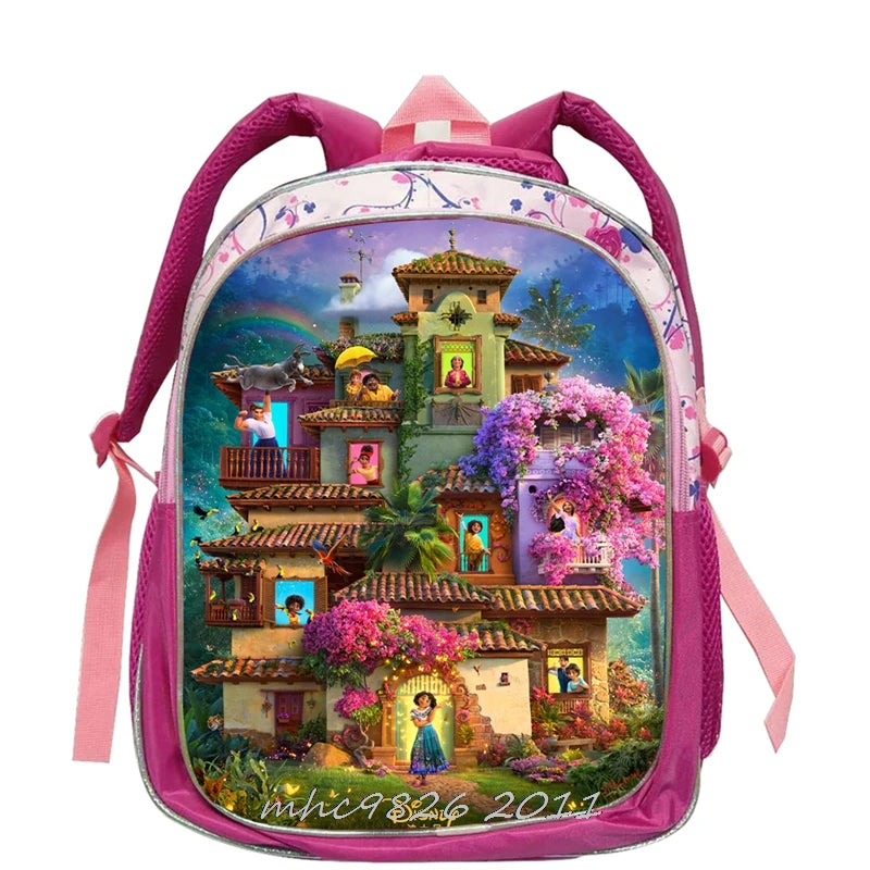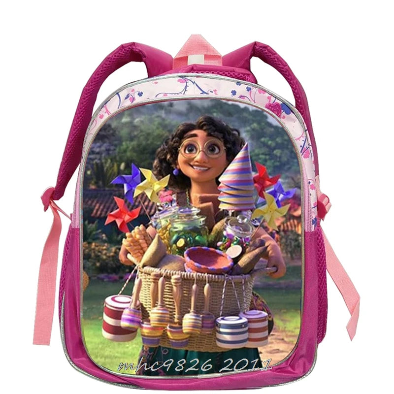 This cute pink backpack is designed for young girls in kindergarten. It features characters from the Encanto movie and is waterproof, perfect for school use.
