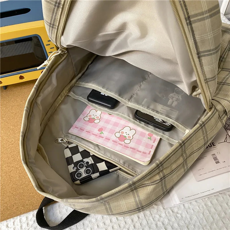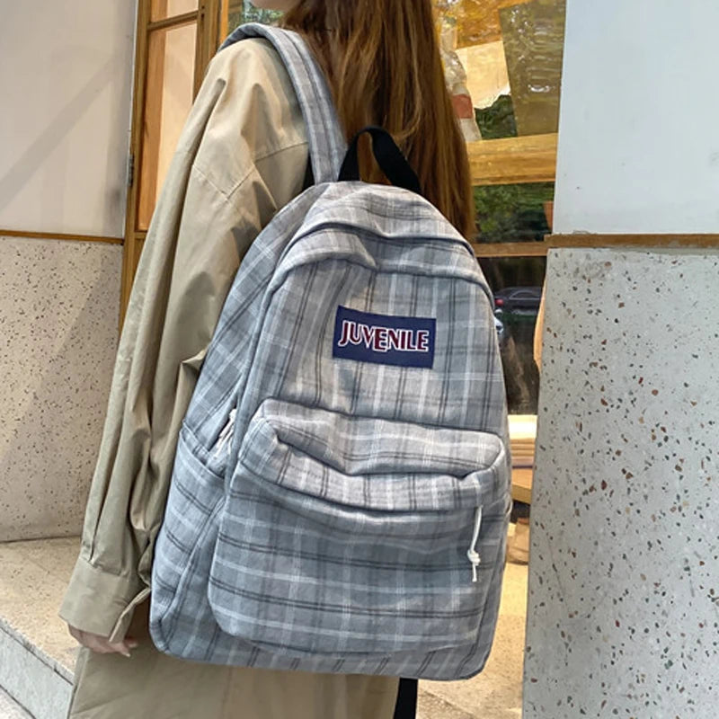 This casual backpack is perfect for students, with a stylish plaid design and lightweight material. Ideal for carrying books, supplies, and everyday essentials.