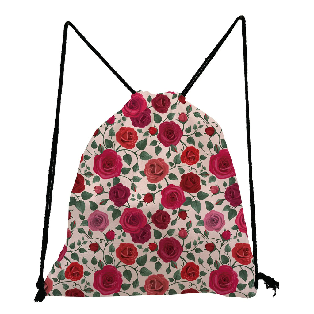 This drawstring bag features a beautiful red rose print, perfect for daily use, birthday parties, or as a gift. It is soft, large, and foldable, making it ideal for children's travel needs.