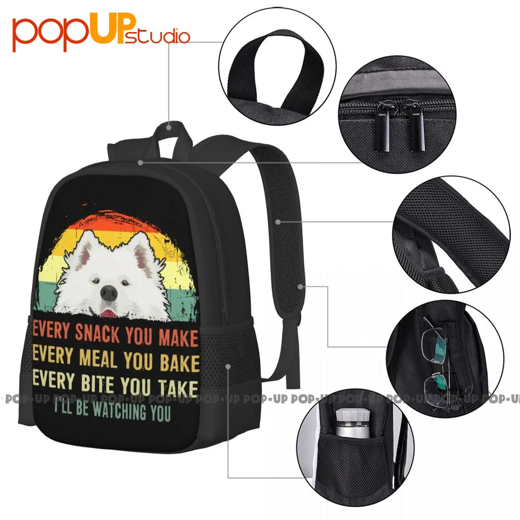 Show your love for your Samoyed with this fun and functional backpack featuring the message 'Every Snack You Make, I'll Be Watching You'. Perfect for dog moms on the go!
