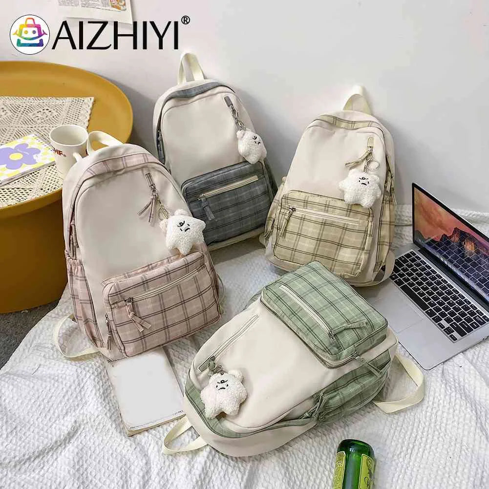 This school backpack is made of durable nylon and features a casual design. It has a zipper pocket for easy access to belongings. Perfect for travel, vacation, or everyday use. The bag also comes with a cute cartoon pendant and plaid design.