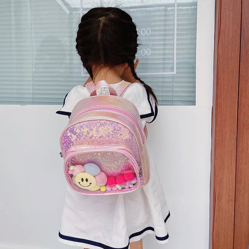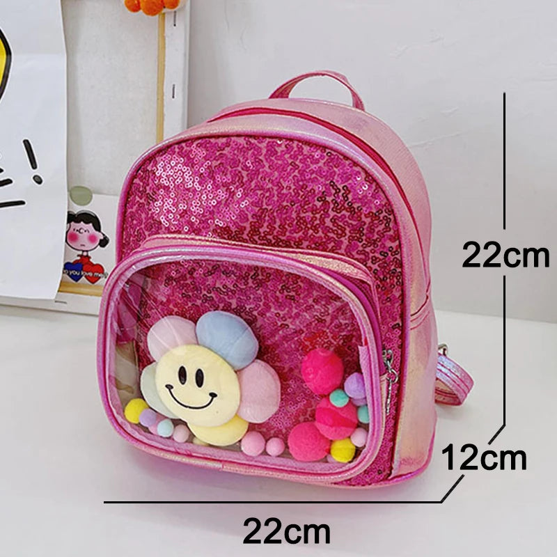 Adorable mini backpack designed for children with sequin and leather material. Perfect for kindergarten school, featuring cartoon characters.