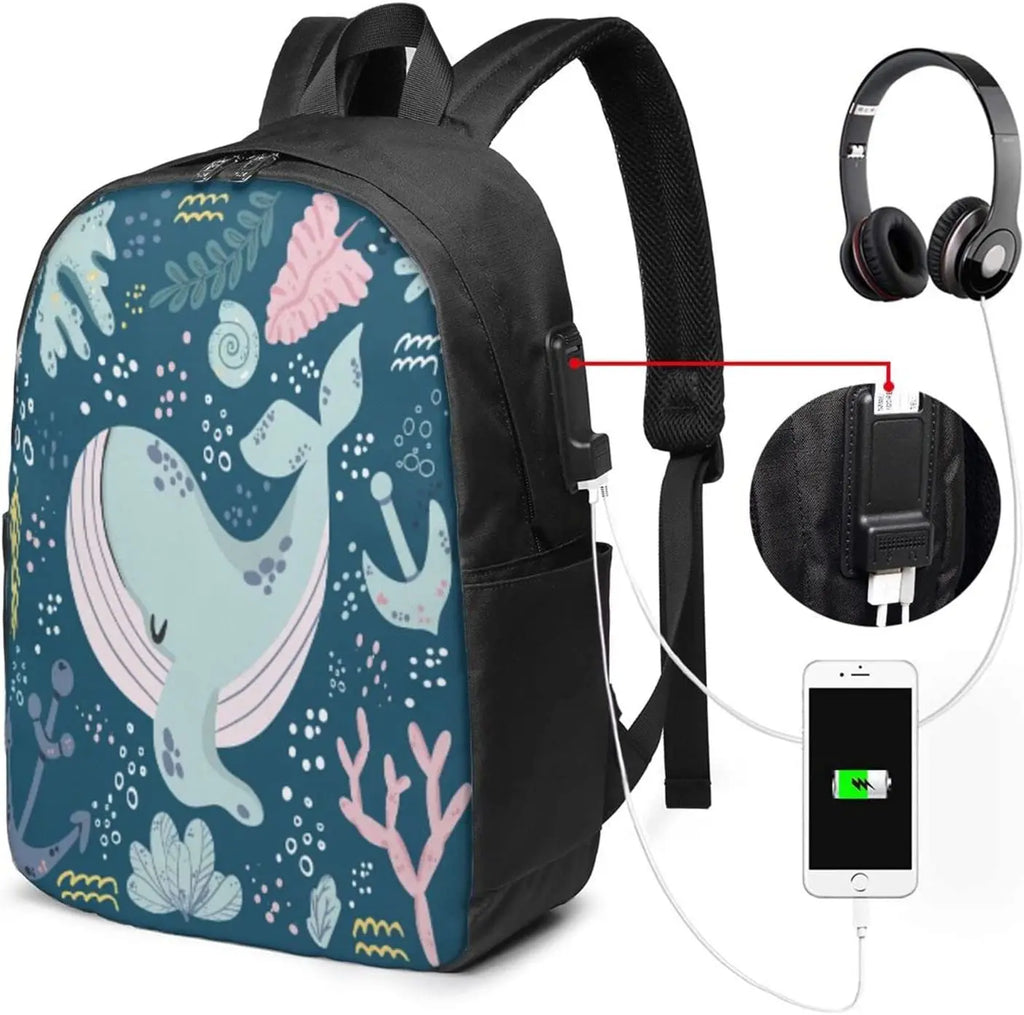 This backpack features a cute sleepy whale underwater doodle cartoon design, perfect for teens, adults, college students, and school use. It also includes a laptop compartment for up to 17-inch laptops.