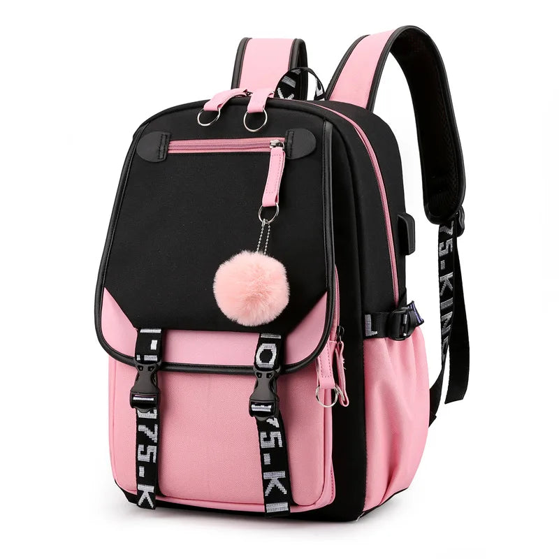 Teen Girls Pink Canvas School Bag USB Port Student Backpack