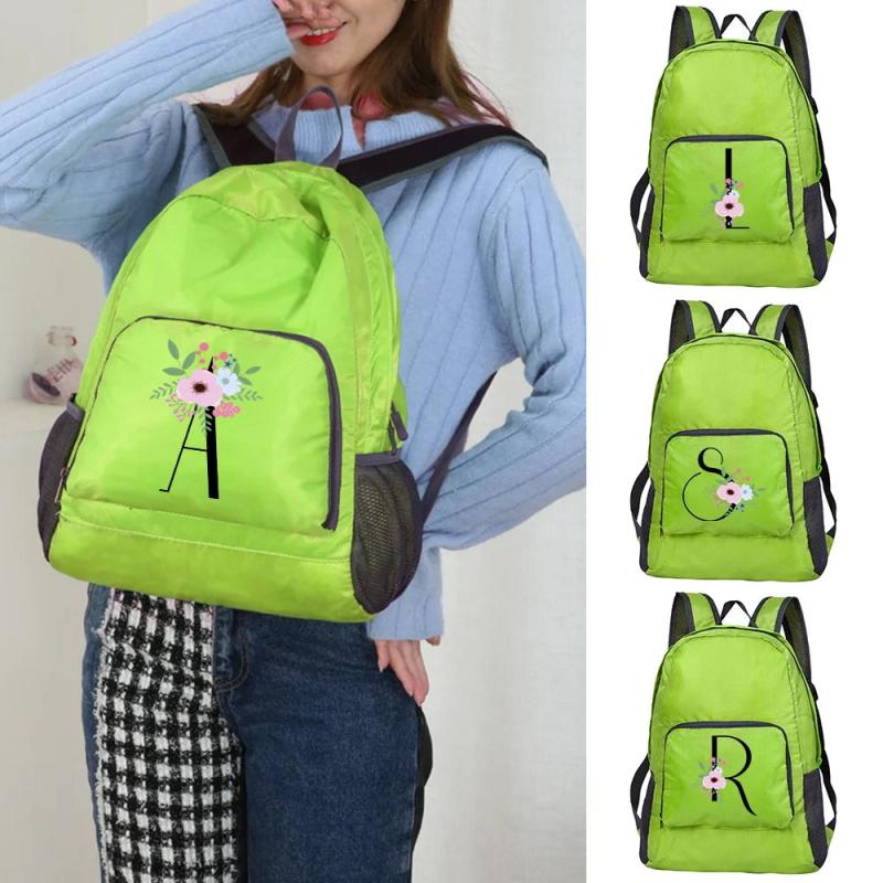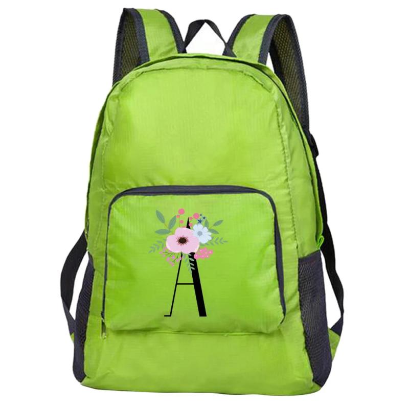 This outdoor folding backpack is ultralight and portable, ideal for mountaineering adventures. It features a beautiful flower and letter design.
