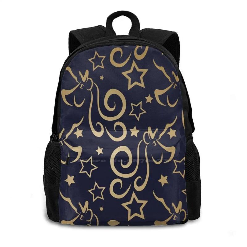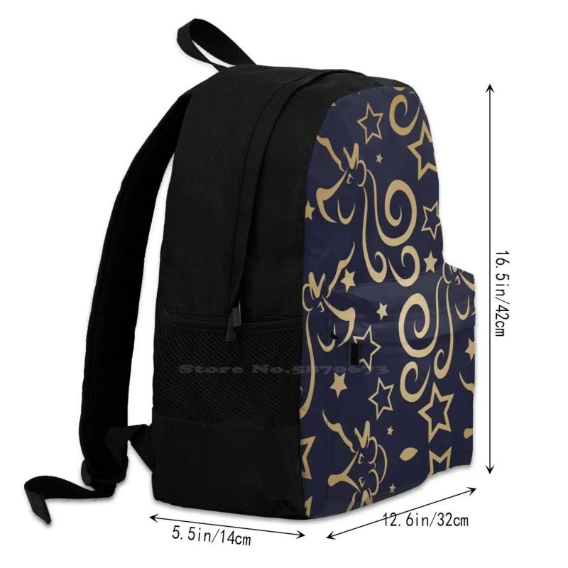 This large capacity backpack features a fun unicorn and stars repeating pattern in navy and metallic colors. It can fit a 15-inch laptop and is perfect for school or travel.