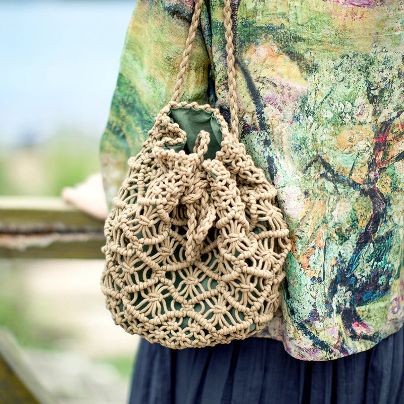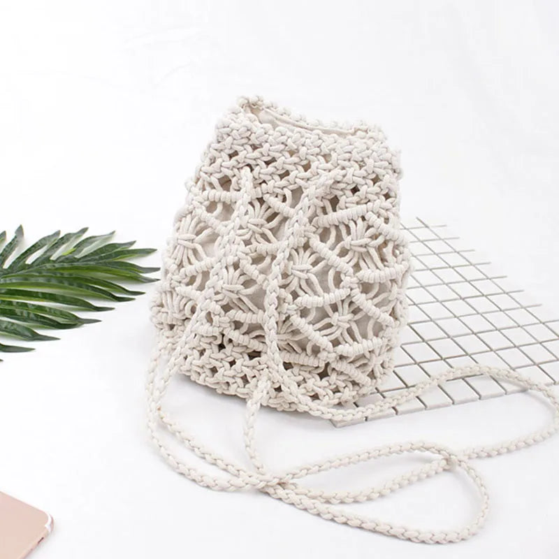 This hand-woven backpack is perfect for vacations and travel. Made of cotton rope, it has a mini fresh design.