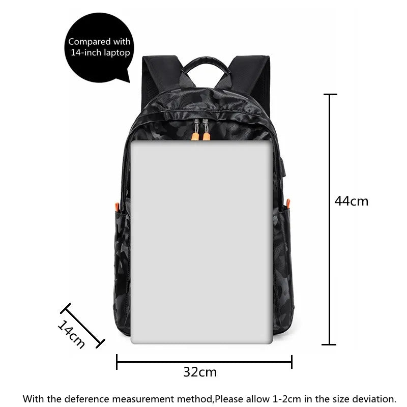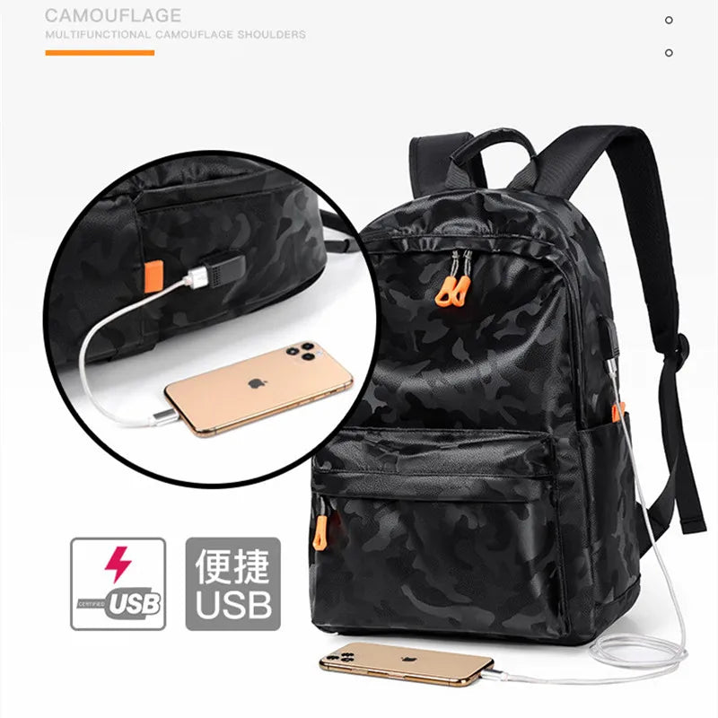 Waterproof Camo Oxford Travel Backpack USB Charging Laptop School Bag