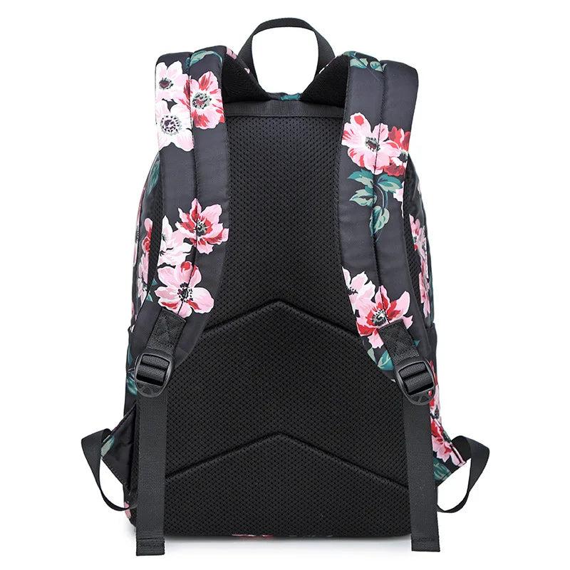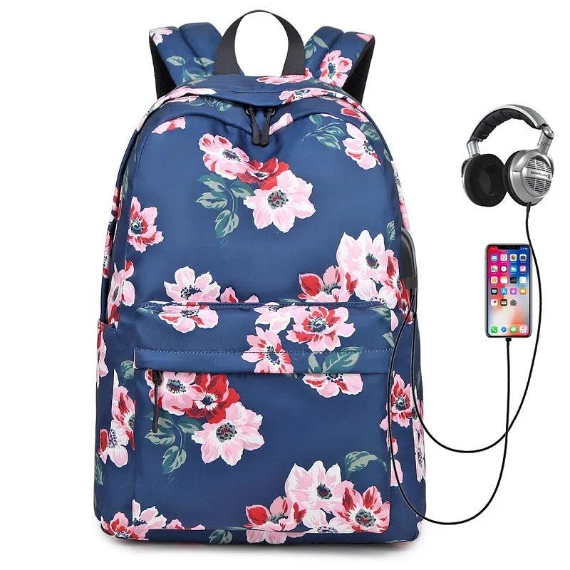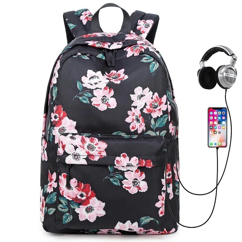 This stylish school backpack features a floral design, waterproof nylon material, USB charging port, ideal for college girls. Perfect for travel, it also functions as a laptop backpack.