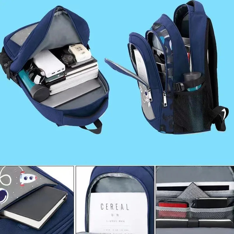 This waterproof children backpack is designed for boys with orthopedic support. It has a large capacity, making it perfect for primary school use.