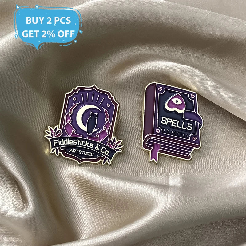 - Enamel pin with witch hat, book, cat, and purple crystal design