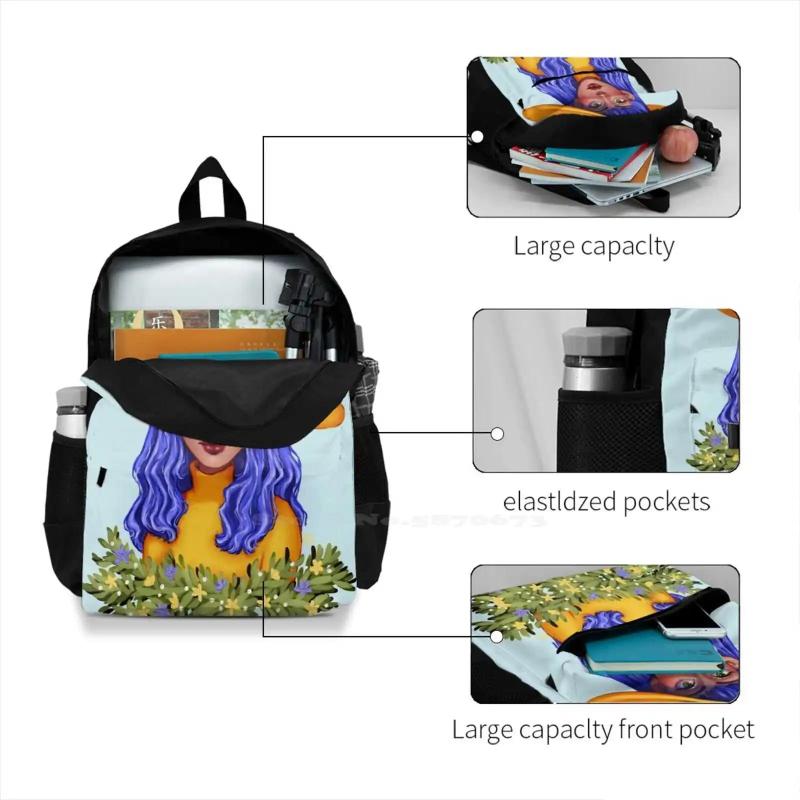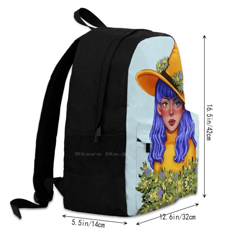 Carry your essentials in style with this witchy green plants backpack featuring a portrait illustration of a yellow witch surrounded by little flowers, herbs, and potions.